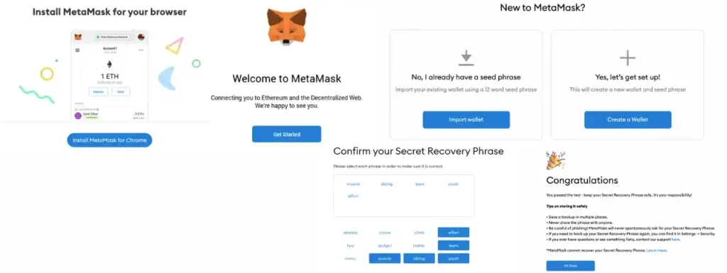 Після встановлення користувач може відкрити MetaMask, створити новий гаманець або імпортувати вже існуючий, але на цьому етапі потрібно особливо уважно зберегти Secret Recovery Phrase у безпечному місці та не передавати її нікому.