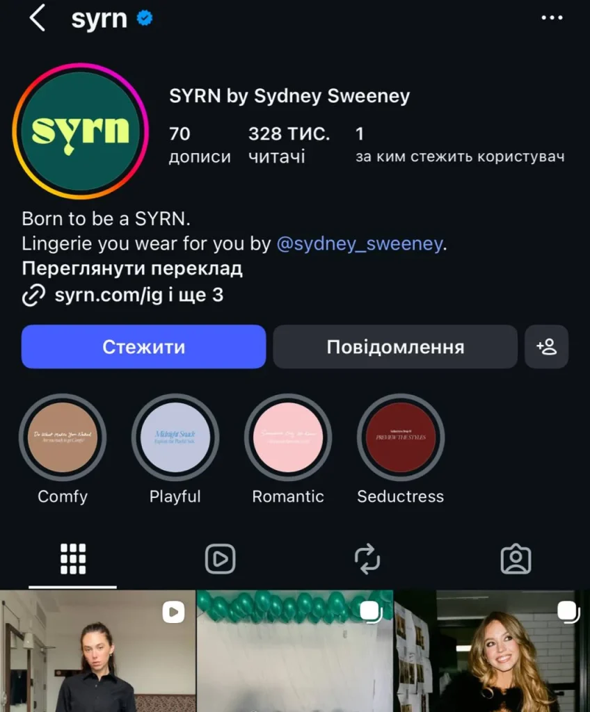 SYRN це новий бренд спідньої білизни, який заснувала Сідні Свіні на початку 2026 року як продовження свого образу сексуальної, але водночас уразливої та сильної жінки. Бренд позиціонує себе як «майданчик для самовираження» й робить ставку на інклюзивність: бюстгальтери випускають одразу у 44 розмірах (діапазон приблизно від 30B до 42DDD), а моделі орієнтовані на різні типи фігур і комфорт у щоденному носінні.